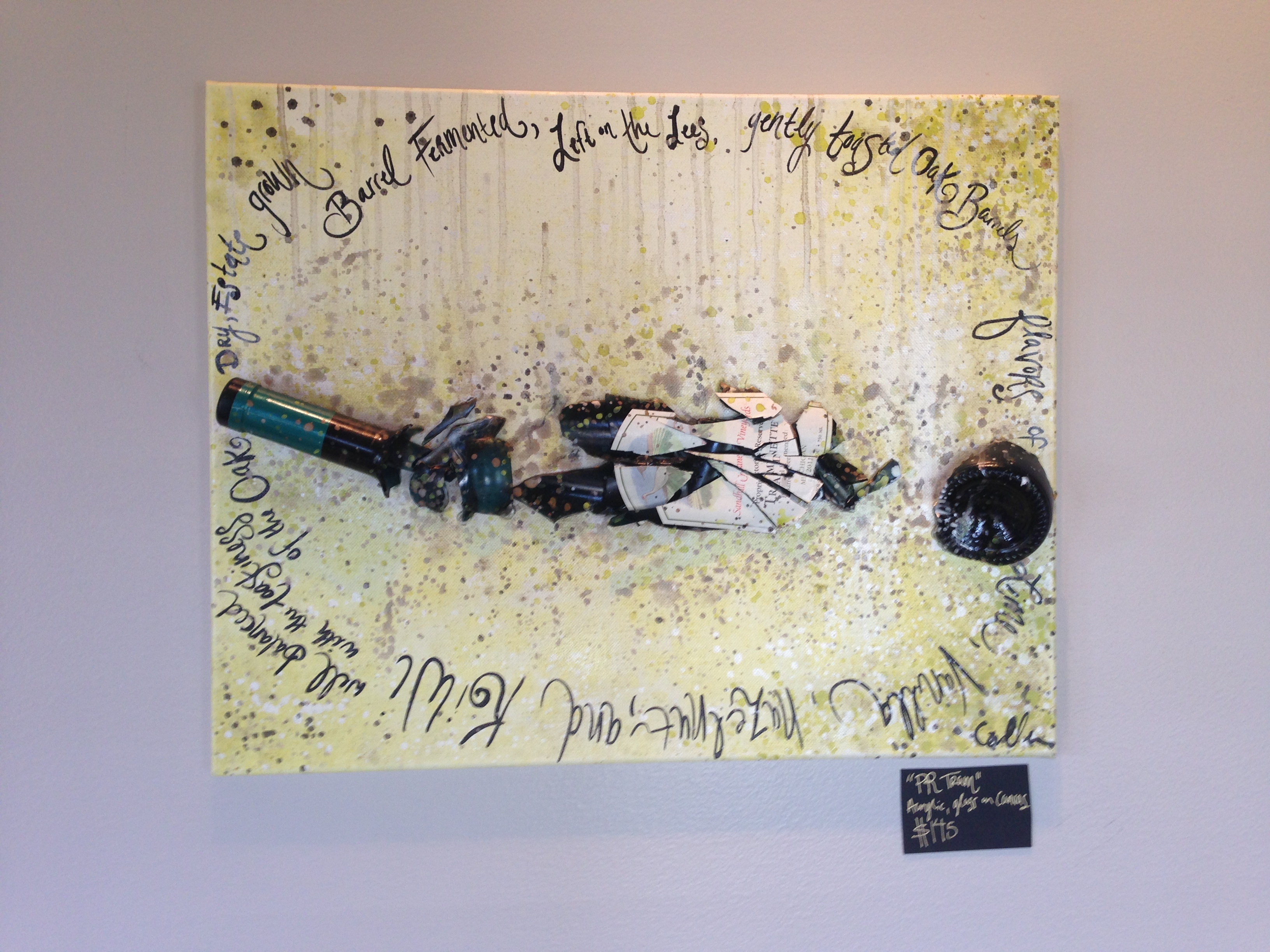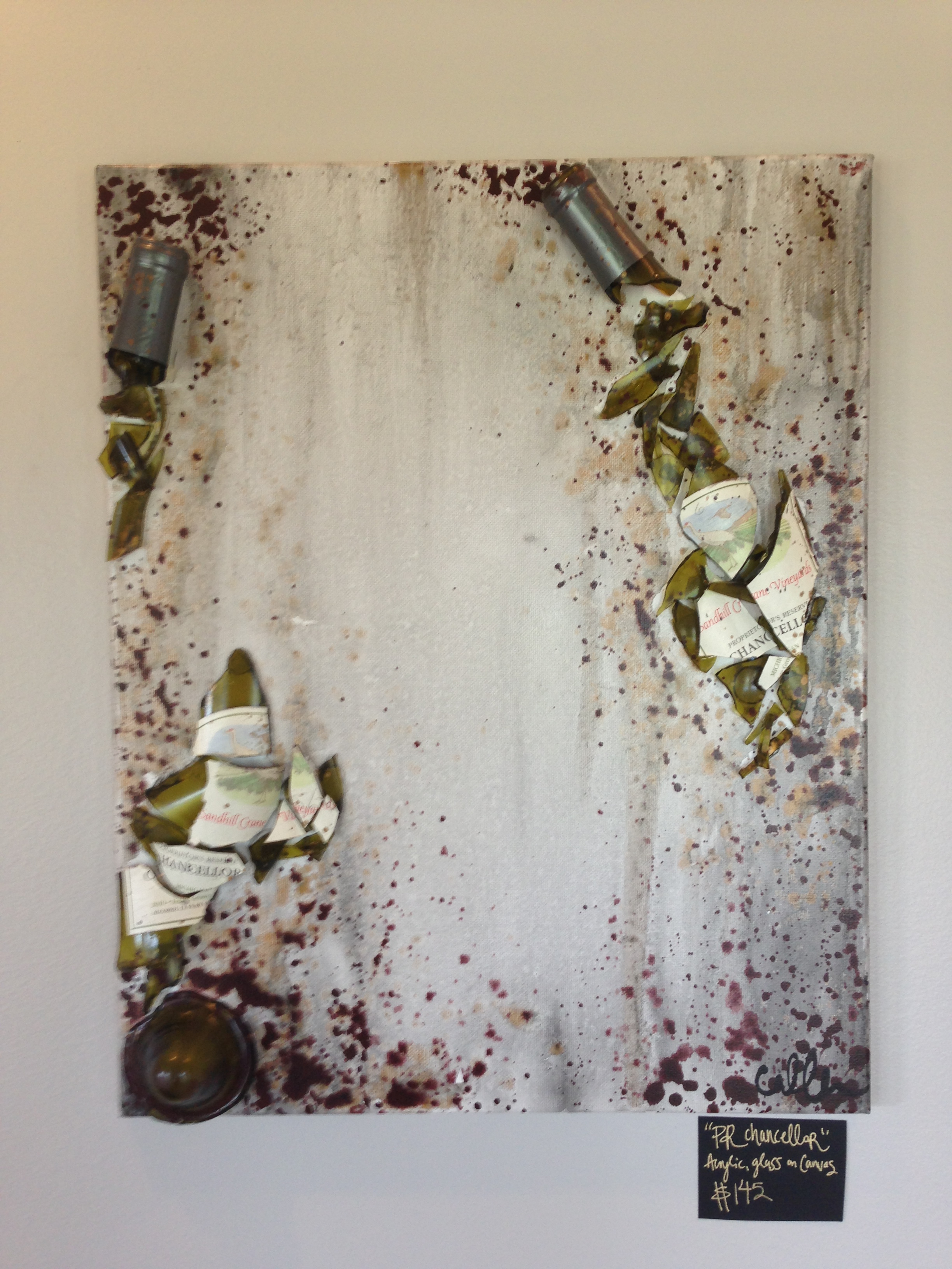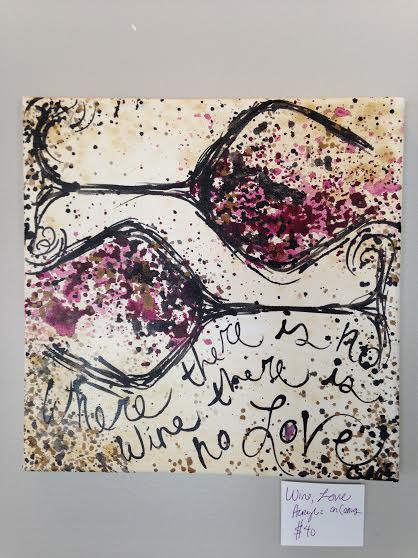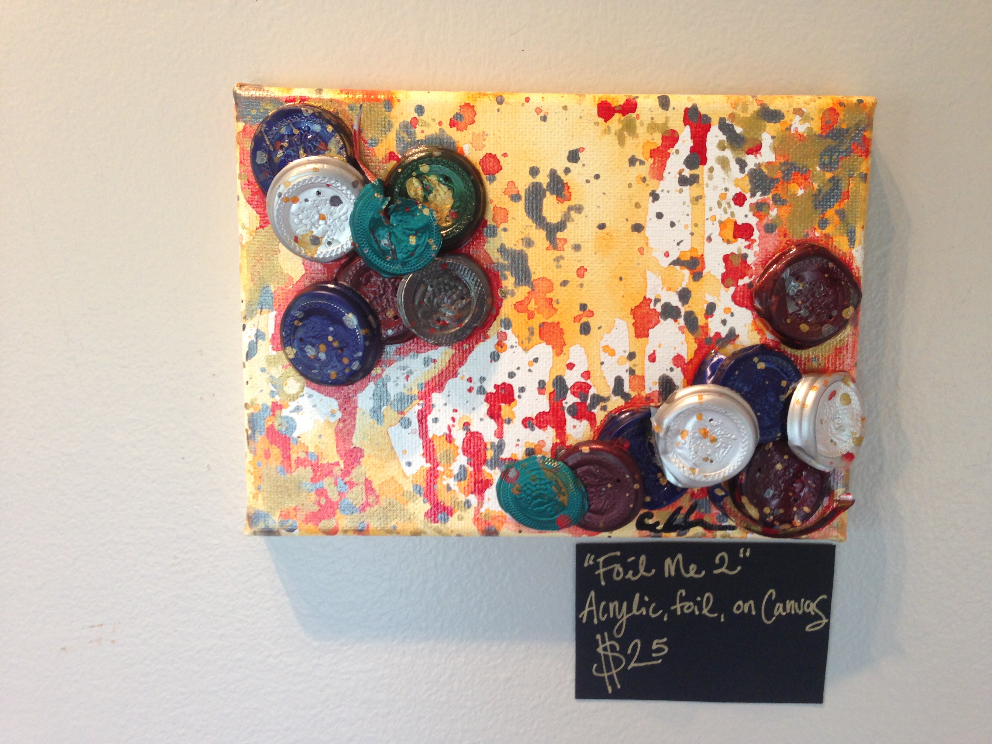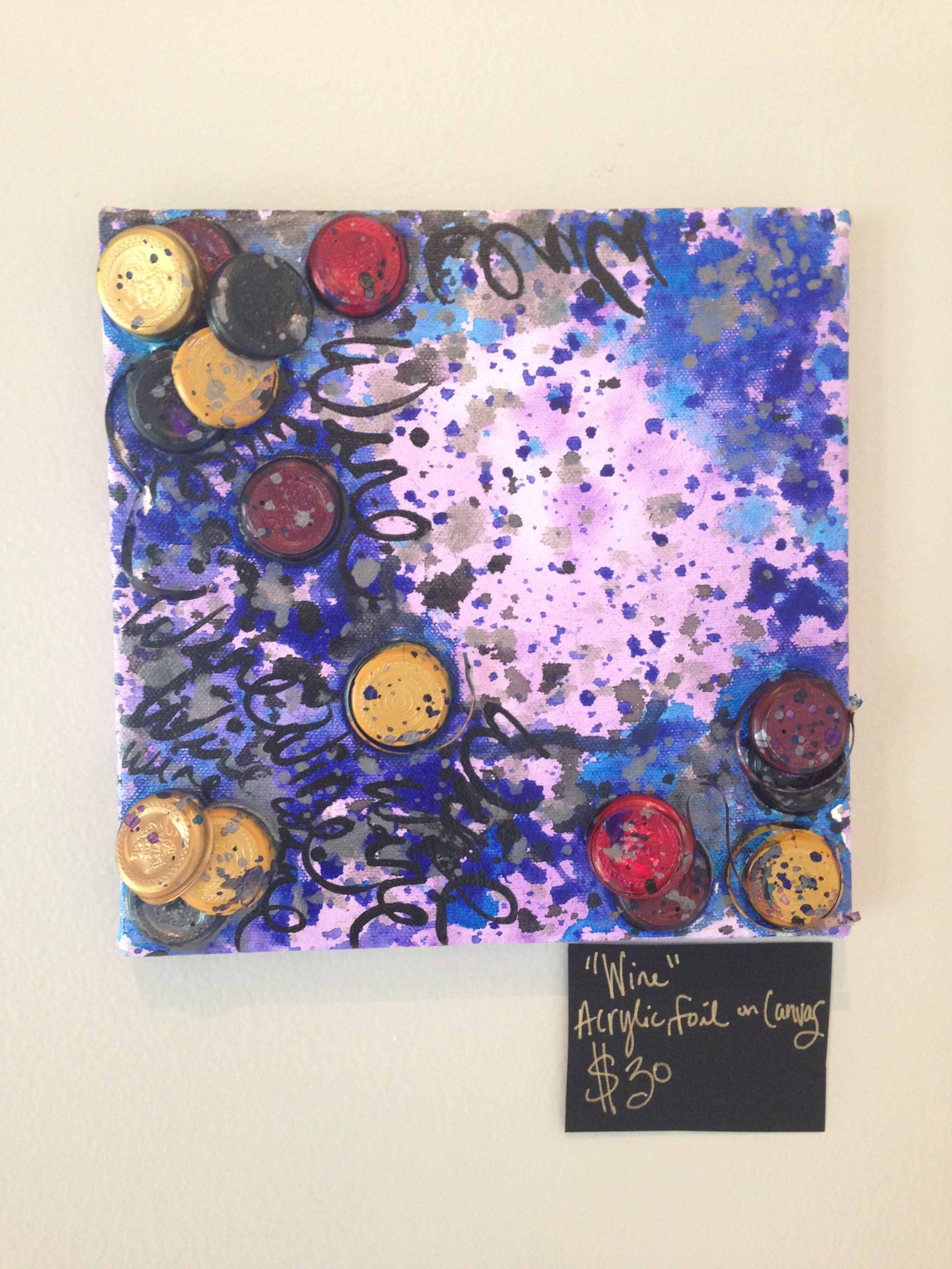 I am beyond grateful, thankful, and blessed to not only enjoy my job, but have the opportunity to showcase my passion in art on the walls of Sandhill Crane Vineyards. Most of the pieces that I displayed were acrylic on canvas. With the exception of a few pieces that I experimented with mixed media, which included the wine bottles that I handled every day, pouring wine for my customers. With every bottle that I opened, I would throw away various colors of foil that cover the cork of each bottle. I realized that these small little foil tops had a beauty of their own and incorporated them in some of my pieces as well. These are the pieces that I proudly displayed;