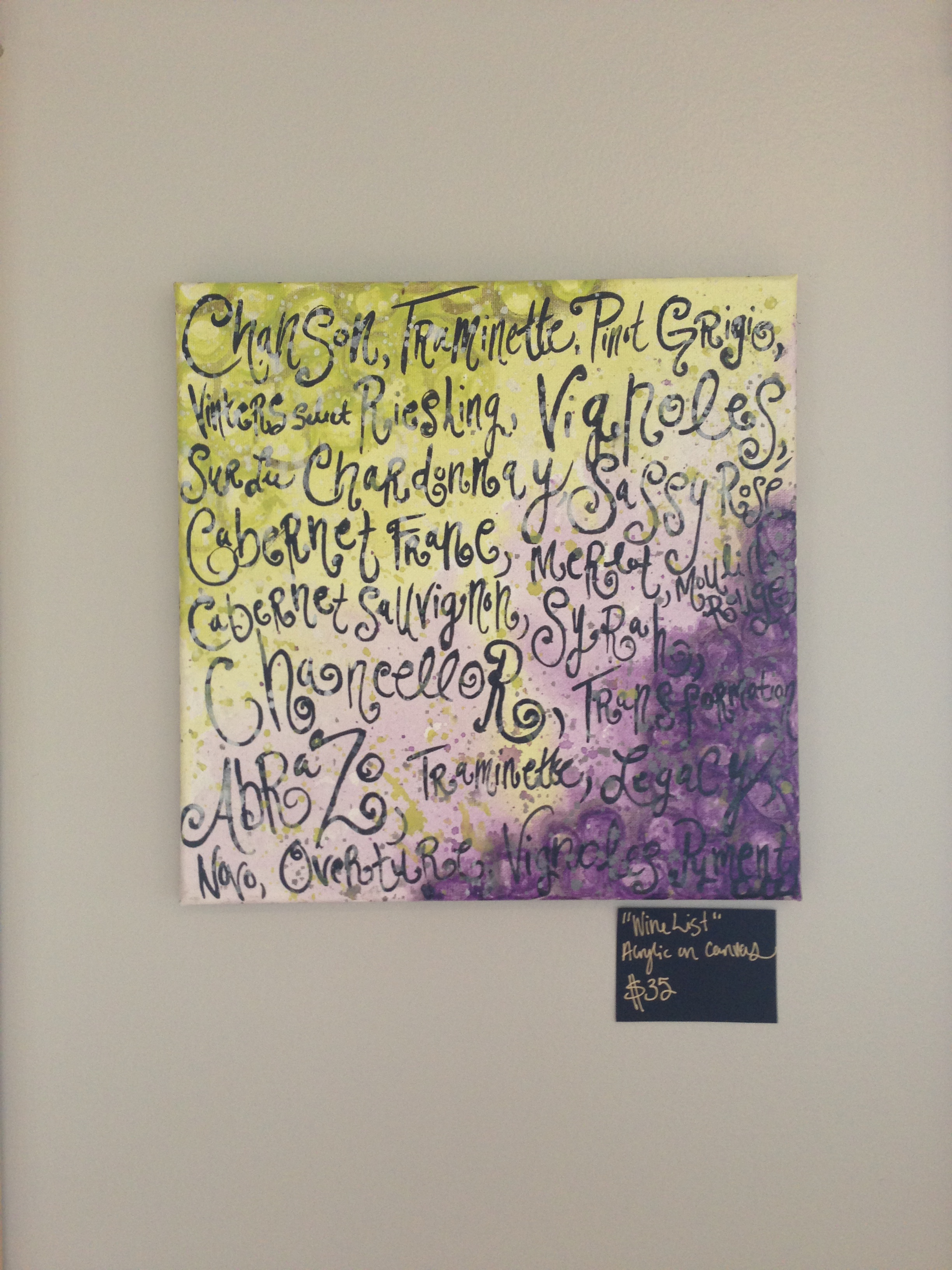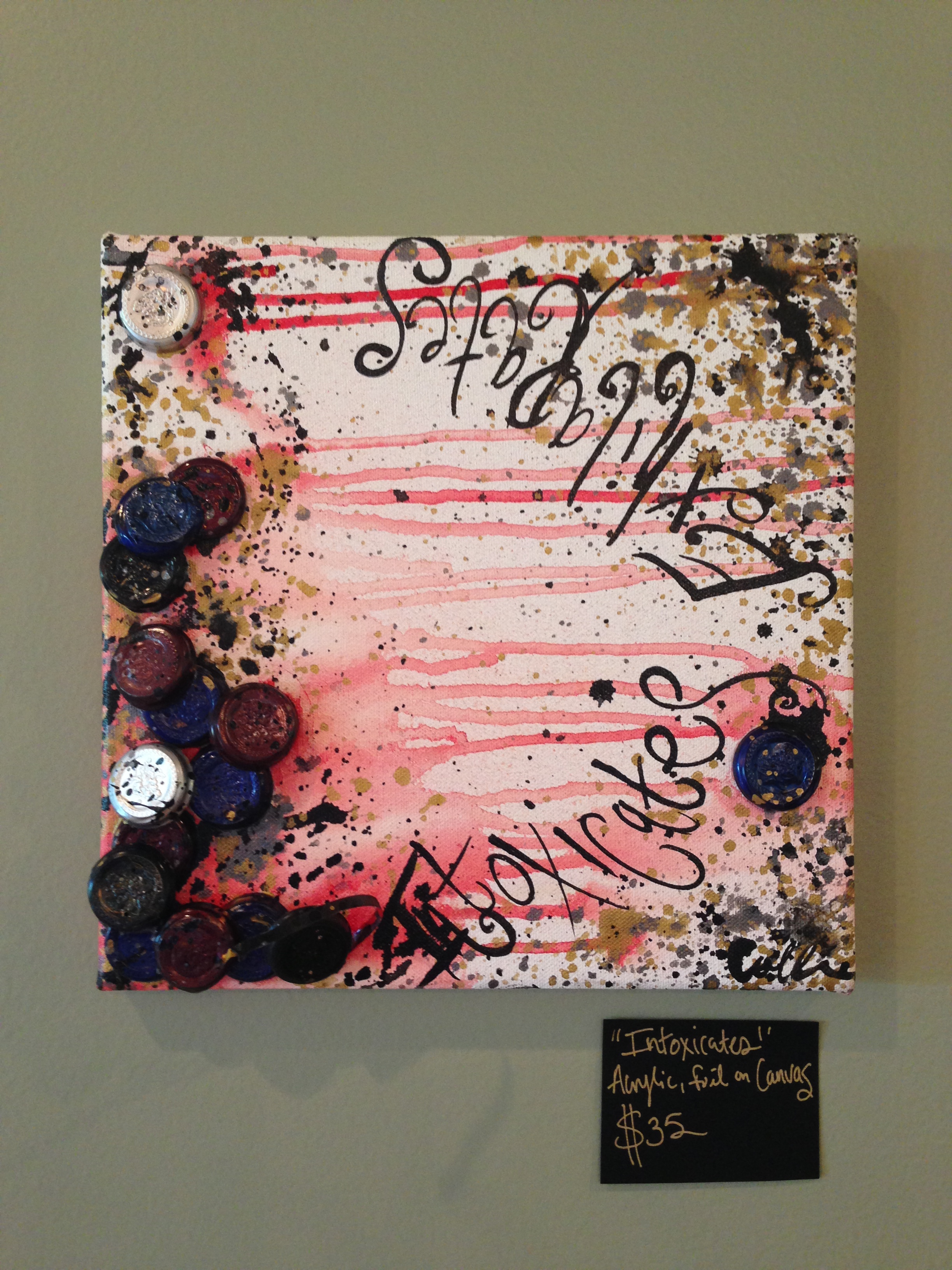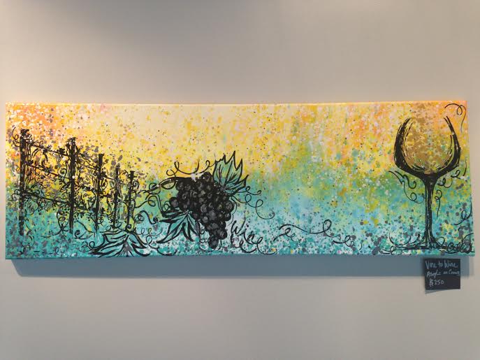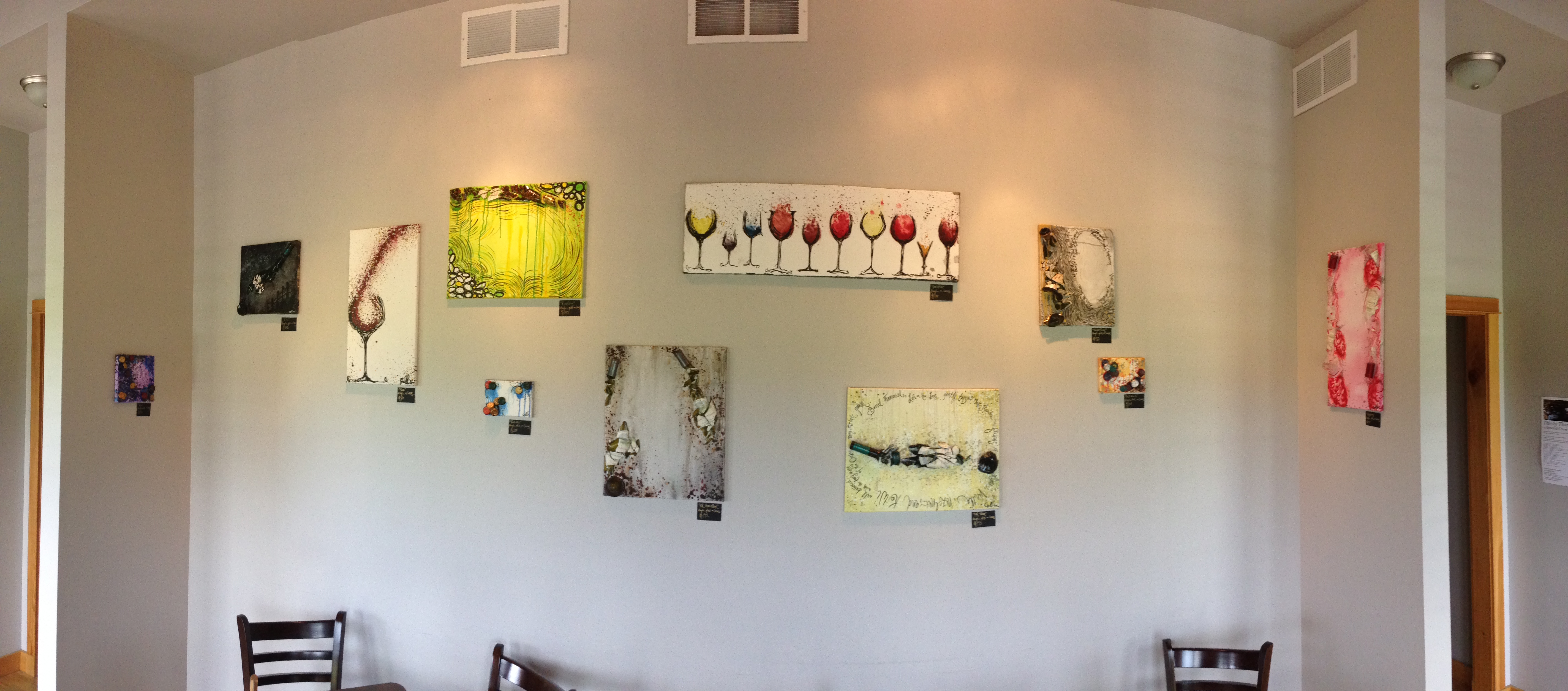 I am beyond grateful, thankful, and blessed to not only enjoy my job, but have the opportunity to showcase my passion in art on the walls of Sandhill Crane Vineyards. Most of the pieces that I displayed were acrylic on canvas. With the exception of a few pieces that I experimented with mixed media, which included the wine bottles that I handled every day, pouring wine for my customers. With every bottle that I opened, I would throw away various colors of foil that cover the cork of each bottle. I realized that these small little foil tops had a beauty of their own and incorporated them in some of my pieces as well. These are the pieces that I proudly displayed;