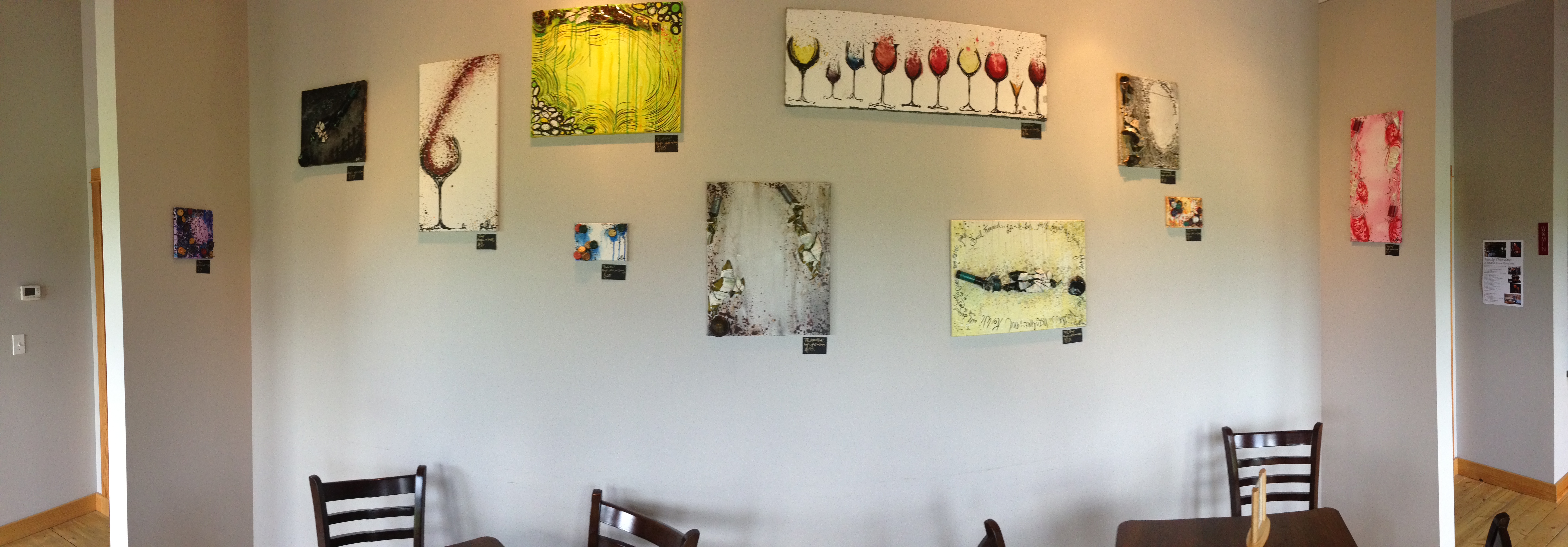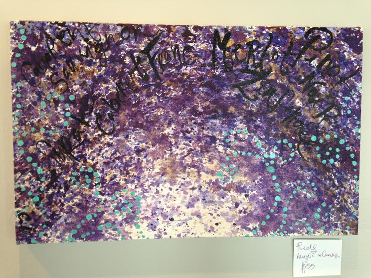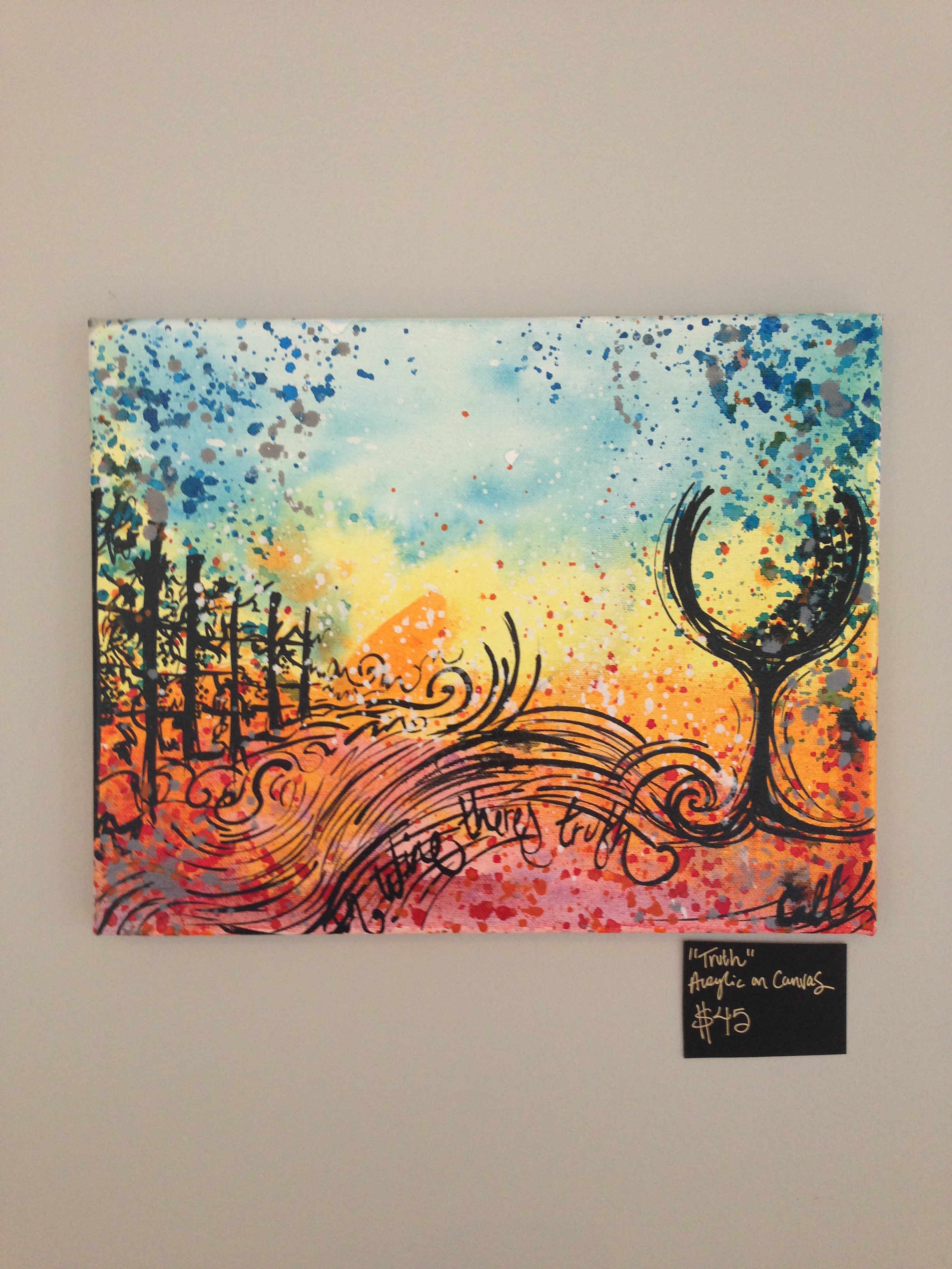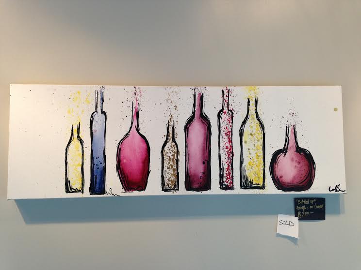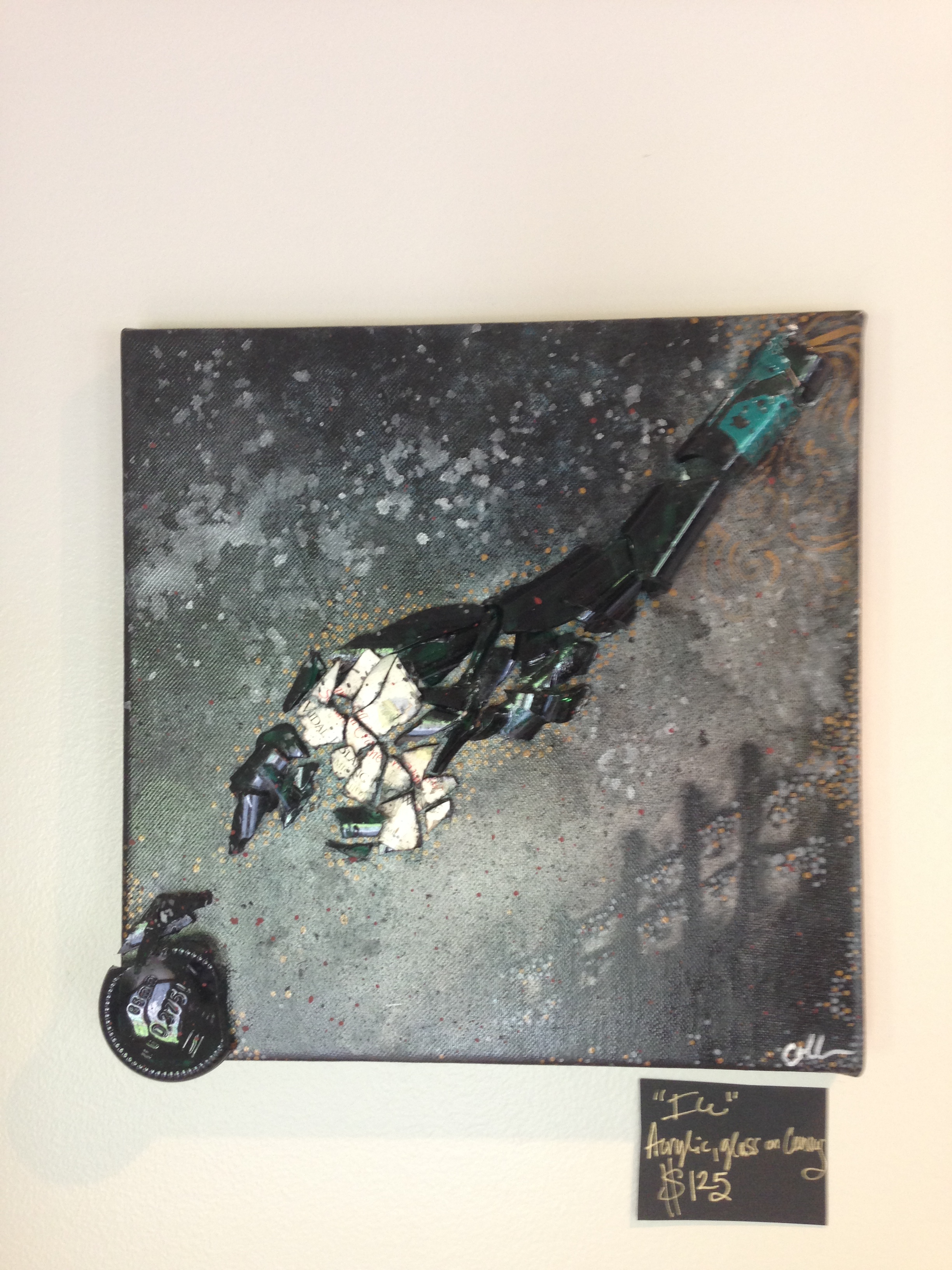 I am beyond grateful, thankful, and blessed to not only enjoy my job, but have the opportunity to showcase my passion in art on the walls of Sandhill Crane Vineyards. Most of the pieces that I displayed were acrylic on canvas. With the exception of a few pieces that I experimented with mixed media, which included the wine bottles that I handled every day, pouring wine for my customers. With every bottle that I opened, I would throw away various colors of foil that cover the cork of each bottle. I realized that these small little foil tops had a beauty of their own and incorporated them in some of my pieces as well. These are the pieces that I proudly displayed;