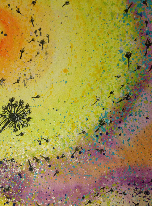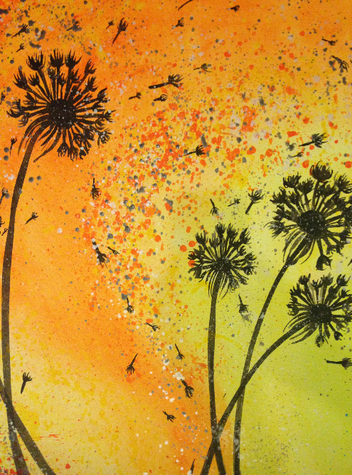 I went into this one only knowing that I wanted it to be warm, to counteract the very cool piece I created. Then I was struck with the idea of making a sunrise effect, followed by my signature messy-ness and paint speckles.